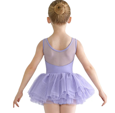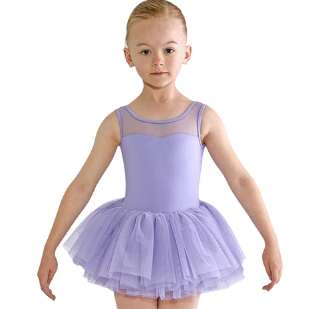 Captivating yet comfortable leotard dress with the front of the piece featuring tank strap styling and a sweetheart bodice framed by a mesh yoke scoop neckline. The back showcases an elegant mesh design as well as an attached, voluminous tutu skirt in the traditional ballet style.
